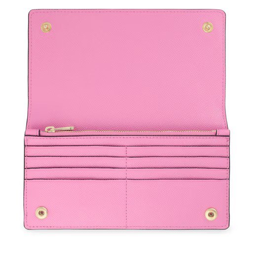 Մեծ TOUS Brenda հավաքածուի դրամապանակ մուգ վարդագույն պոլիուրեթանից: Ներսում կա վեց քարտի տեղ, թղթադրամների համար հատված և մետաղադրամների համար հատուկ կայծակաճարմանդով առանձնացված հատված: Չափերը ՝ 12 x 19.5 x 3 սմ: