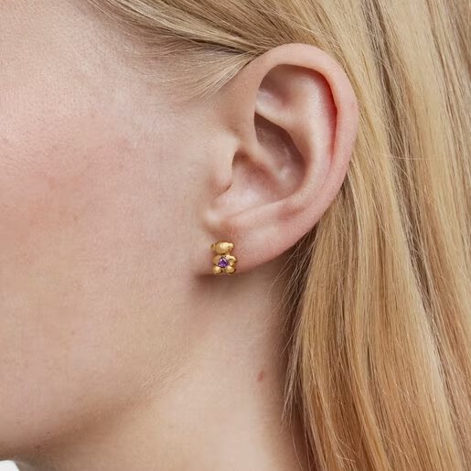 Fall in love with our icon in its most contemporary incarnation with these small bear earrings with 18kt gold plating over silver and an amethyst from the Bold Bear collection. Perfect circles, carefully designed to give life and volume to your new charm. Small TOUS Bold Bear 3D earrings with 18 kt gold plating over silver and trillion amethyst. Gemstone size: 3 mm. Size of bear: 8.6 mm. Push back. It is made of sterling silver with 18 to 23 kt gold plating and has a thickness of 3 microns. This quality guarantees a greater durability of the jewel.