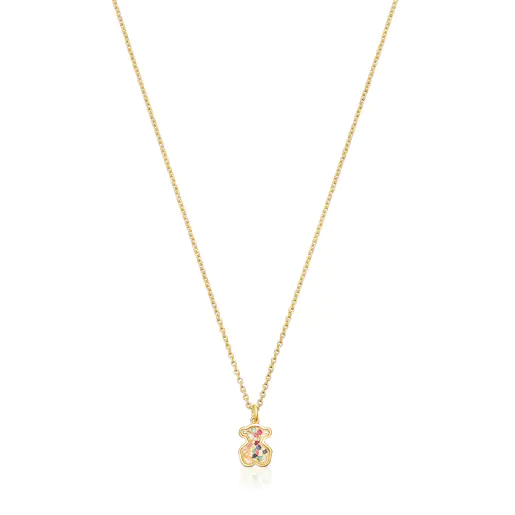 Ожерелье TOUS Areia из позолоченного серебра с медведем с фрагментами перидота, обработанного сапфира, сердолика, обработанного изумруда, цитрина и обработанного рубина внутри. Размер медведя: 10 мм. Длина ожерелья: 45 см, с кольцом на высоте 40 см. Серебро 925 пробы, покрытое 18-каратным золотом толщиной от 3 до 5 микрон, без других металлов между ними. Техника изготовления: литье.