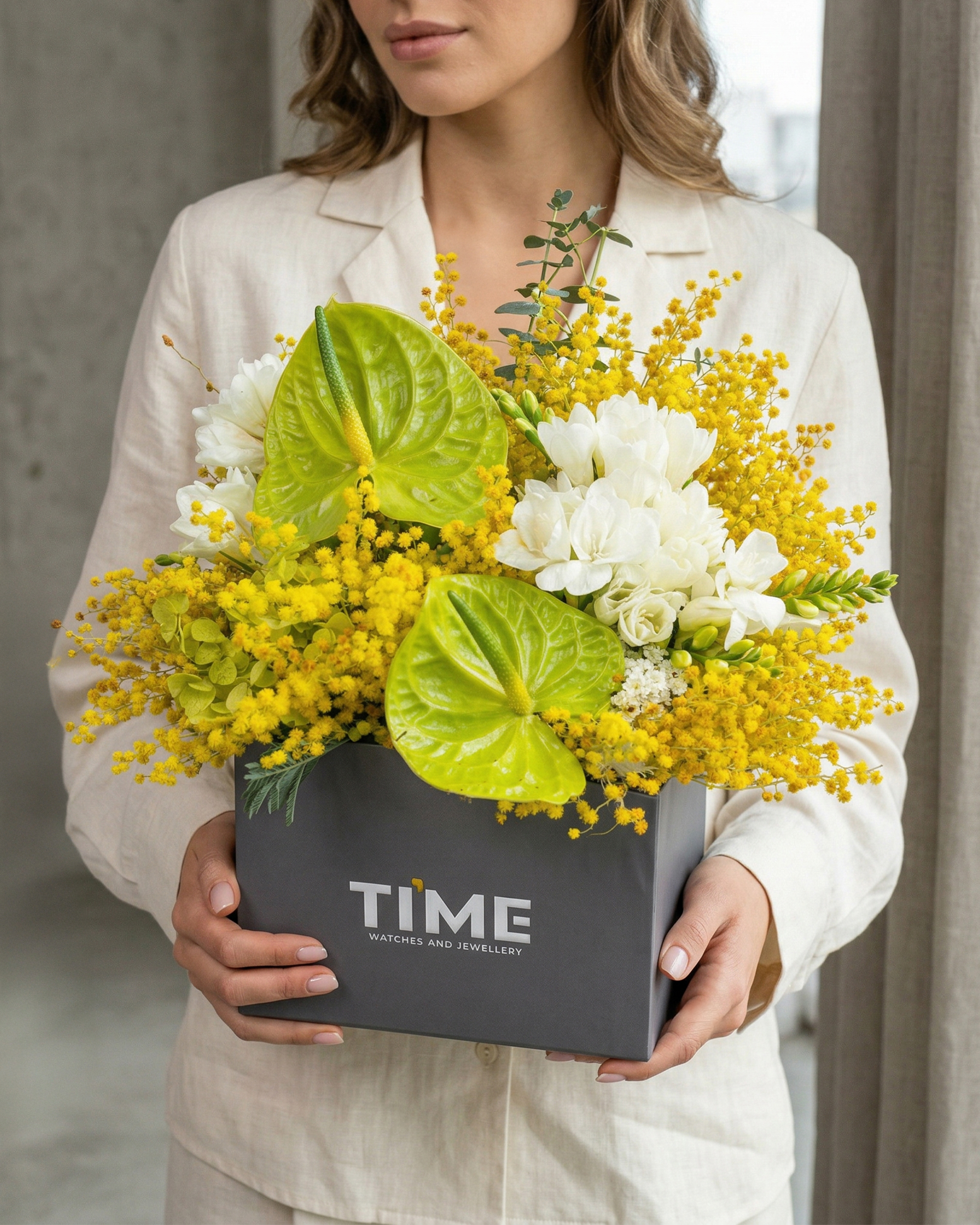 Яркая, уверенная и наполненная жизнью композиция. Солнечные облака мимозы в сочетании с лаймовыми антуриумами и белыми фрезиями создают выразительную и элегантную цветочную аранжировку.