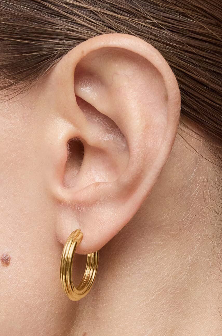 TOUS 1950 օղակաձև ականջօղեր 18 կարատ ոսկու շերտով պատված արծաթից՝ ներսում ծաղկաձև դետալով։ Ականջօղերի չափսը՝ 22 մմ։ Փական՝ սեղմվող։ Պատրաստված է ստերլինգ արծաթից՝ 18-ից 23 կարատ ոսկու շերտով (3 միկրոն հաստությամբ), որն ապահովում է զարդի բարձր դիմացկունությունը։