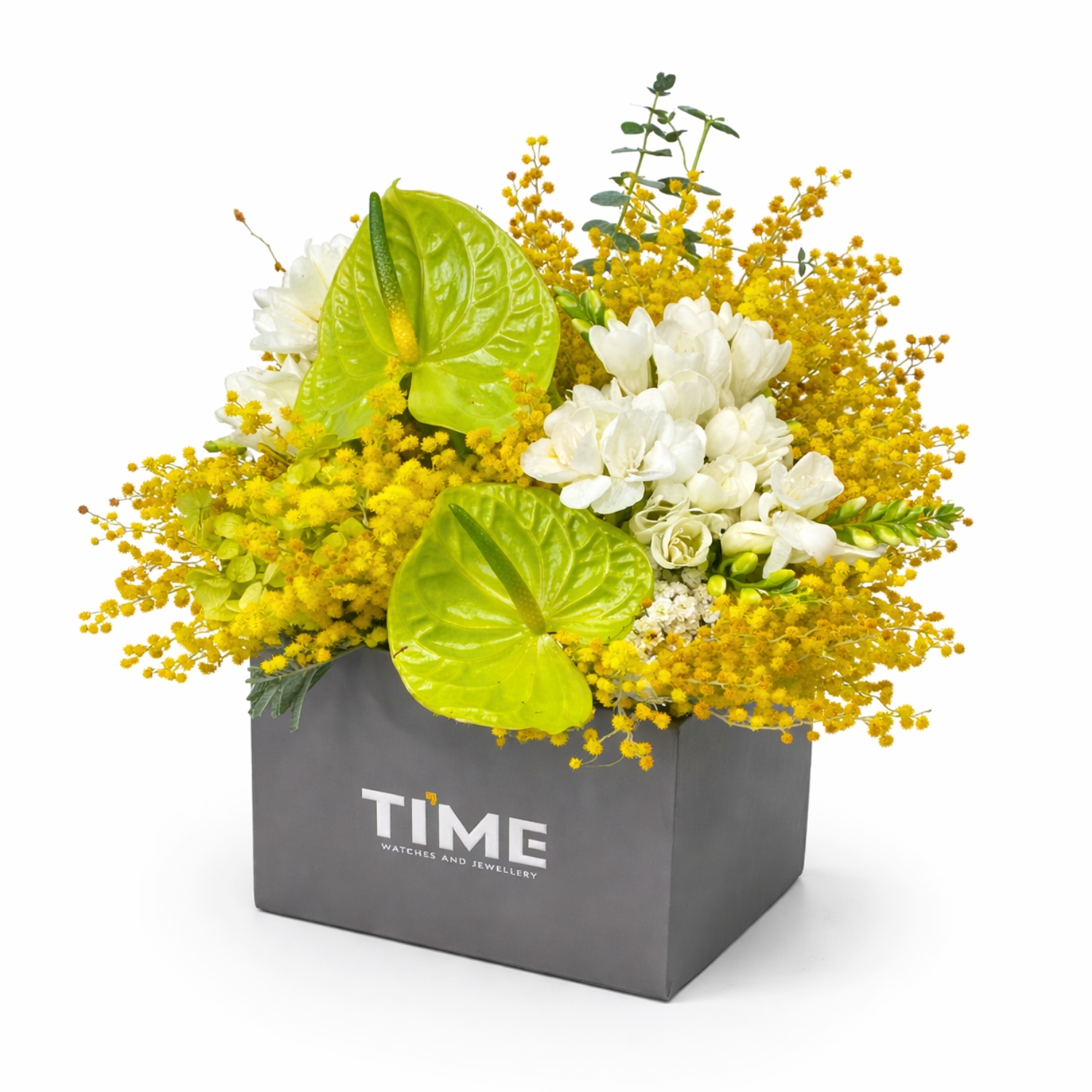 Яркая, уверенная и наполненная жизнью композиция. Солнечные облака мимозы в сочетании с лаймовыми антуриумами и белыми фрезиями создают выразительную и элегантную цветочную аранжировку.